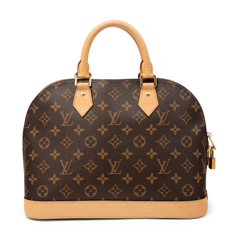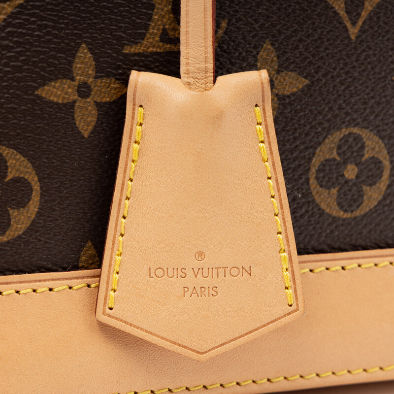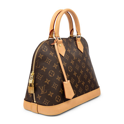 Alma PM handbag in monogram coated canvas with vachetta leather trim. Locking double zipper closure, rolled leather handles, and removable & adjustable flat leather shoulder strap.