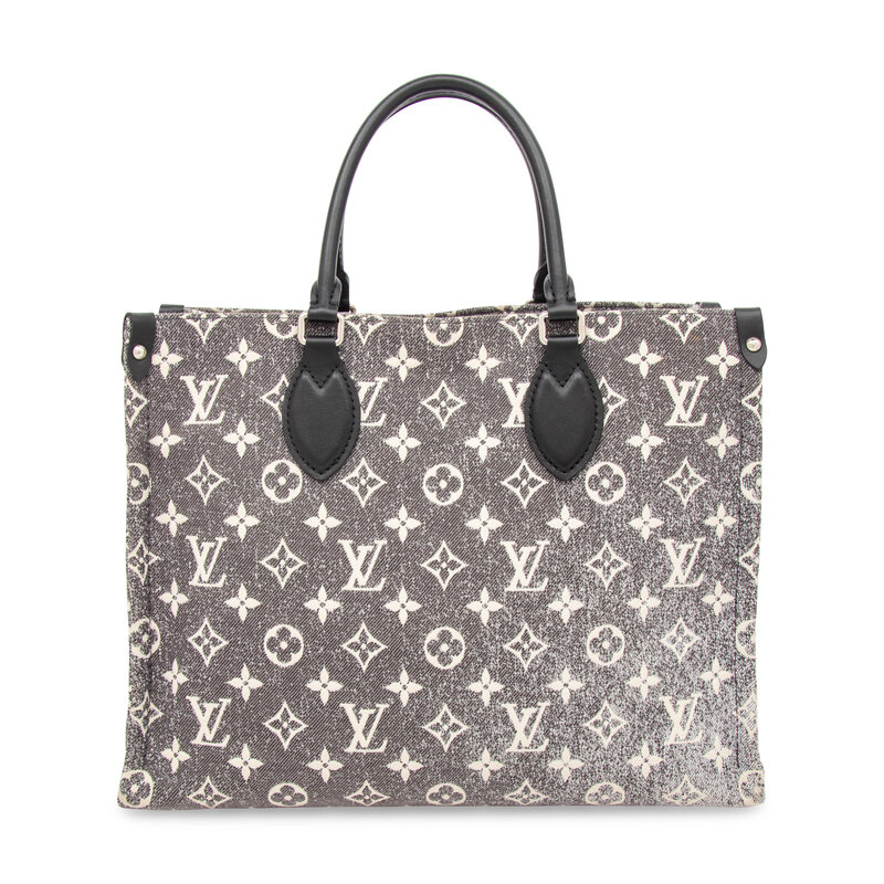 OnTheGo MM tote bag in grey monogram jacquard denim. Latch closure at interior, rolled leather handles, and flat retractable leather straps.
