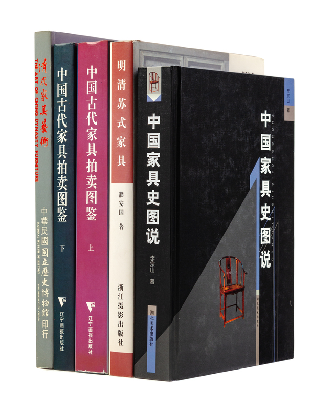 Ruan Changjiang, Illustrated Chinese Furniture Through the Ages, 1992; Pu Anguo, Ming Qing Sushi Jiaju, 1998; Tian Jiaqing, Ming Qing jiaqu jianshang yu yanjiu, 2003; Kai-yin Lo, Classical and Vernacular Chinese Furniture in the Living Environment, 1998; Chinese Furniture Research Institute, LLC, Classical Chinese Furniture: An Exhibition of the Kimbal-Jenkins Estate, 2004; Hu Wenyan, Zhongguo jiaju jianshang yu yinshang, 1994; Li Zongshan, Zhongguo jiaju shitu shuo, 2000 (2); National Museum of History, Republic of China, The Art of Ching Furniture, 1985; Xu Daqing and Yu Shitao, eds., Zhongguo gudai jiaju paimai tujian, Volumes I & II, 1996; Wang Shixiang, Self-Cherished Treasures of Twin-Pine Studio: A Listing of Items, 2002 (2); Yi-an Cai, Chinese Furniture in Cantonese Style, 1993; Mei Ninghua and Tao Xincheng, eds., Gems of Beijing Cultural Relics Series: Furniture, 1999; Yang Yao, Ming shi jiaju yanjiu, 1984; Shanghai Museum, Chinese Ming and Qing Furniture Gallery, (2); National Museum of History, Republic of China, The Furniture of Ch'ing Dynasty: the Art Pieces with Utility Purposes, 1988; Wang Nianxiang, Ming shi jiaju diaoke yishu, 2001; National Palace Museum, Special Exhibition of Furniture in Paintings, 1996; Lu Zhirong, Qingdai jiajuj, 1996; Pu Anguo, Zhongguo hongmu jiaqu, 1996.