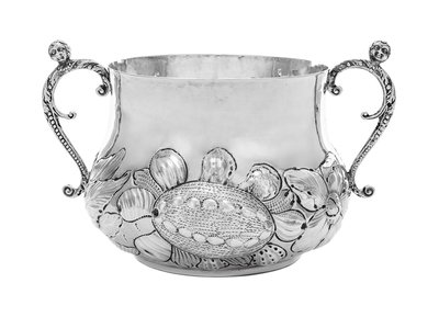 the ovoid body with repousse fruit and foliate motifs, with female mask-capped scroll and beaded handles.