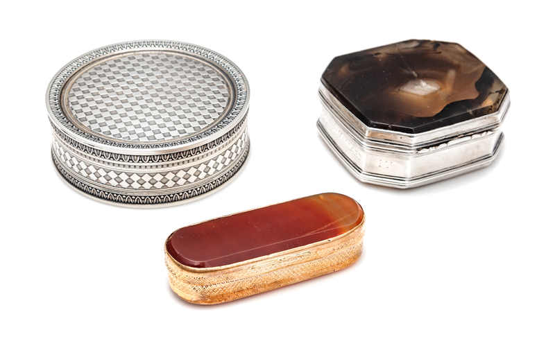 of square form with canted corners, the side engraved William Turner/Joseph Mallard 1785, together with a French silver circular example and a continental gilt-metal an agate example.