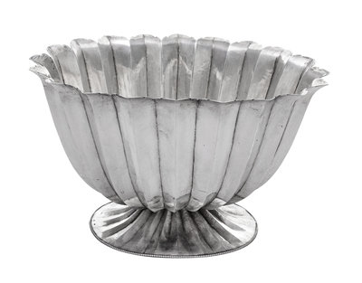 of tapering oval form, the scalloped rim and fluted body raised on a conforming pedestal foot with a beaded rim.