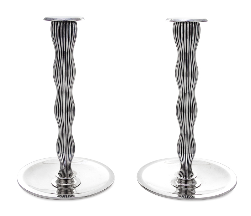 of tapered and undulating ribbed cylindrical design, each raised on a circular dish base.
