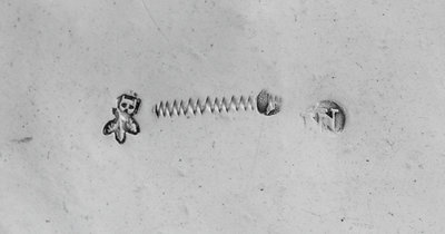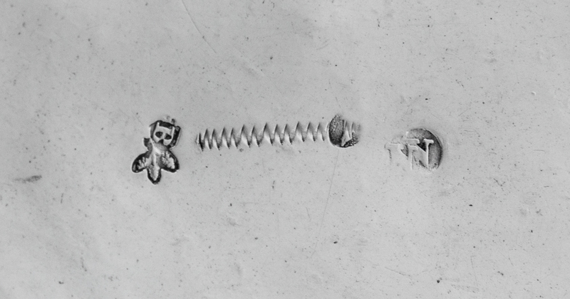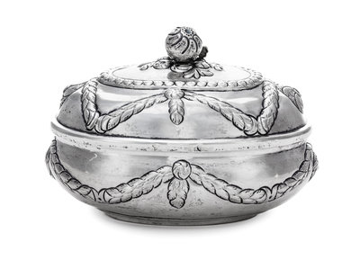the hinged oval box worked with repousse husk garland swags, the lid with fruit finial.