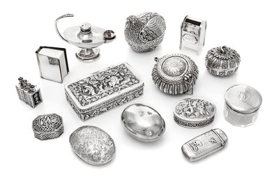 comprising a Chinese export silver quadruple medicine bottle marked for Ju Hua, two Chinese export silver snuff boxes, five Southeast Asian/Indian boxes, an American silver vesta case, pocket-dictionary cover, covered jar, snuff box and stamp box, and a Mexican silver oil lamp.