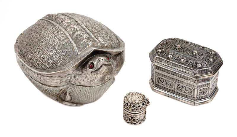 in the form of a turtle with cabochon inset eyes, together with a rectangular box with canted corners and an American thimble case marked for Webster Co., Attleboro, MA.