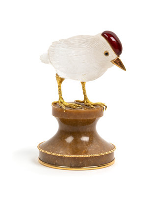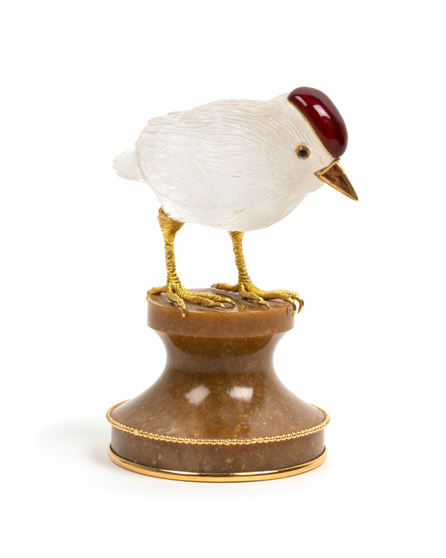 of a bird on a carved hardstone and gold rimmed base.