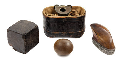 comprising a horn and pewter-mounted snuff box, a hardstone paperweight, an Asian lacquered box and a copper ink pot.