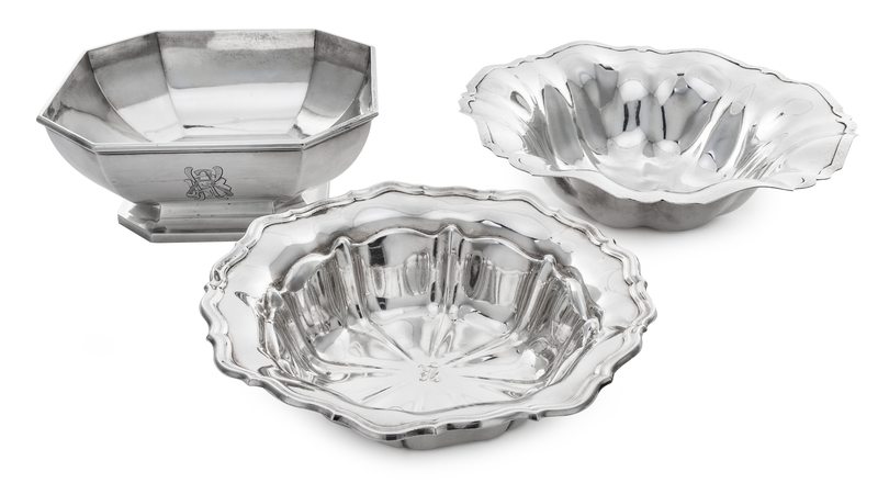 comprising a bowl marked Gorham Mfg. Co., Providence, RI, 1912, a similarly decorated example marked Shreve & Co., San Francisco, CA, and an octagonal example marked Wm. B. Durgin Co., Providence, RI.