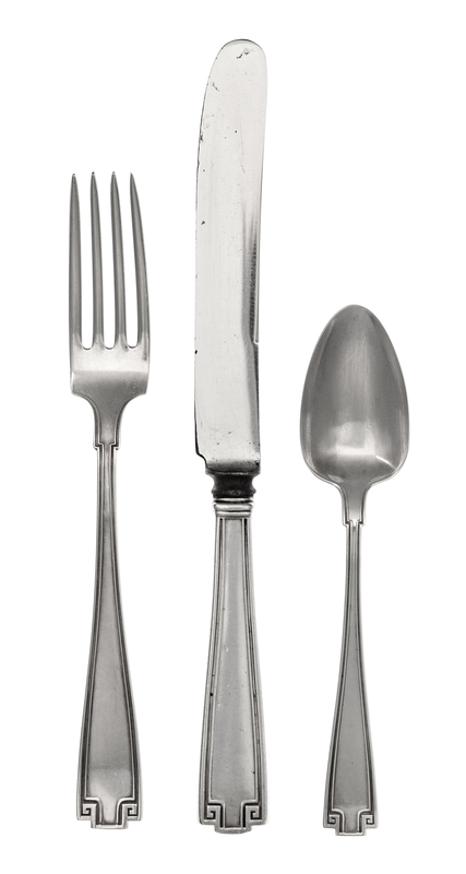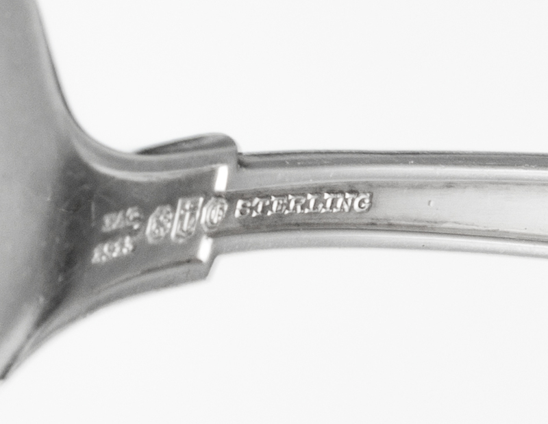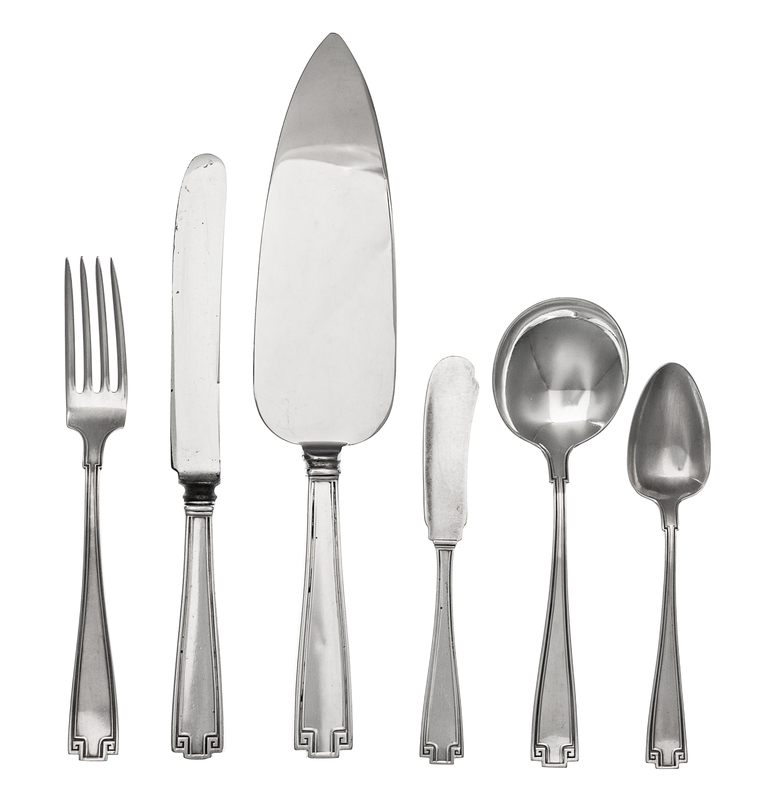Etruscan pattern, comprising: 11 dinner knives11 dinner forks12 soup spoons19 teaspoons11 butter spreaderstogether with one 7 5/8 inch dinner fork of the same pattern.