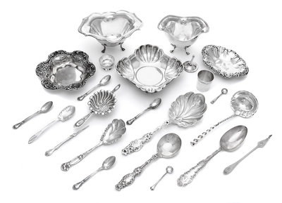 comprising two footed bowls, three nut dishes, tea strainer, sugar bowl, shot glass and flatware articles.
