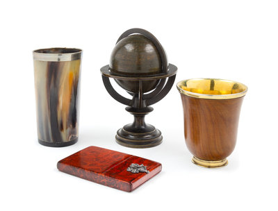 comprising a bronze miniature globe on stand, a silver-mounted horn beaker, a silver-mounted wood cup in leather travel case and a silver-mounted burlwood card case.