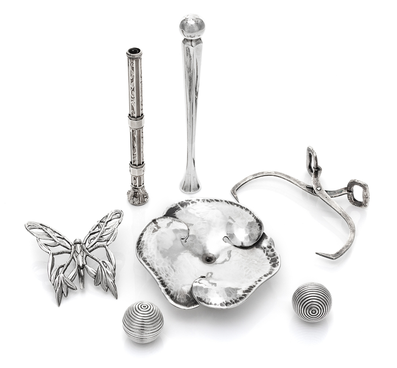 comprising a pair of George III silver spherical vinaigrette's marked for Birmingham, 1803, an American silver muddler and sugar tongs marked for Tiffany & Co., New York, NY, and a lily pad-form table ornament, together with a gilt-metal compound pencil and fountain pen and a silvered metal butterfly clip.
