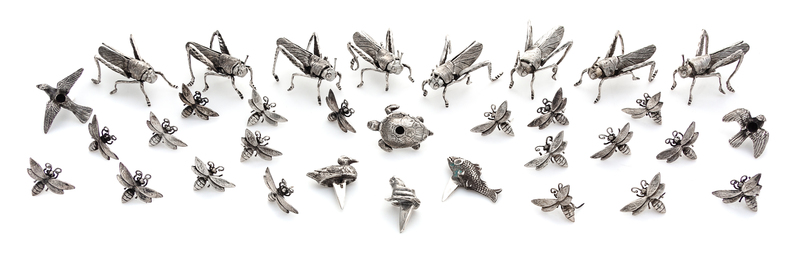 comprising a set of eight Grasshopper-form placecard holders, a set of six hors d'Oeurves picks and a set of nineteen wasp-form thumbtacks.