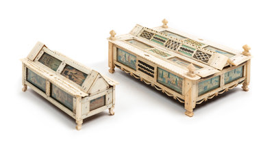 each with sliding panels enclosing game pieces, fitted with watercolor figural scenes.