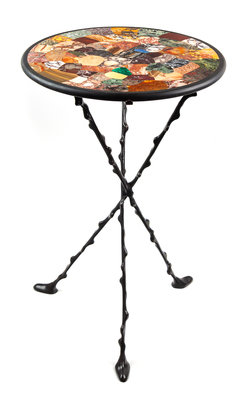 the circular specimen marble top raised on a simple wrought-iron stand.