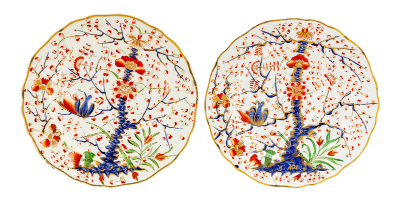 each in lobed circular form and painted in colored enamels and gilding, with flowering branches in the center.
