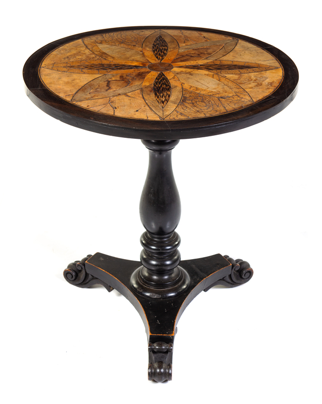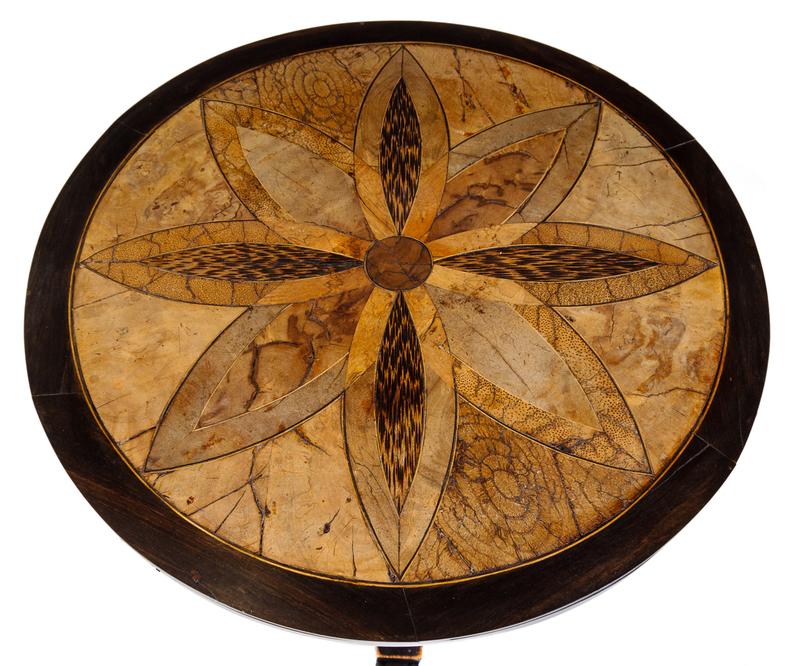 the circular top with flowerhead design within calamander border, baluster shaft on triangular base on scrolled feet.
