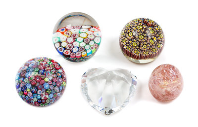 comprising a Millefiori decorated example stamped for Baccarat, two similarly decorated unmarked examples, an ovoid form Murano glass example and a heart-shaped example by Tiffany & Co.