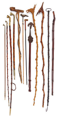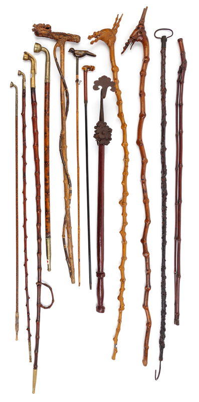 comprising four smoking pipes, six canes, one long hook; together with a bronze mounted hardwood stick.