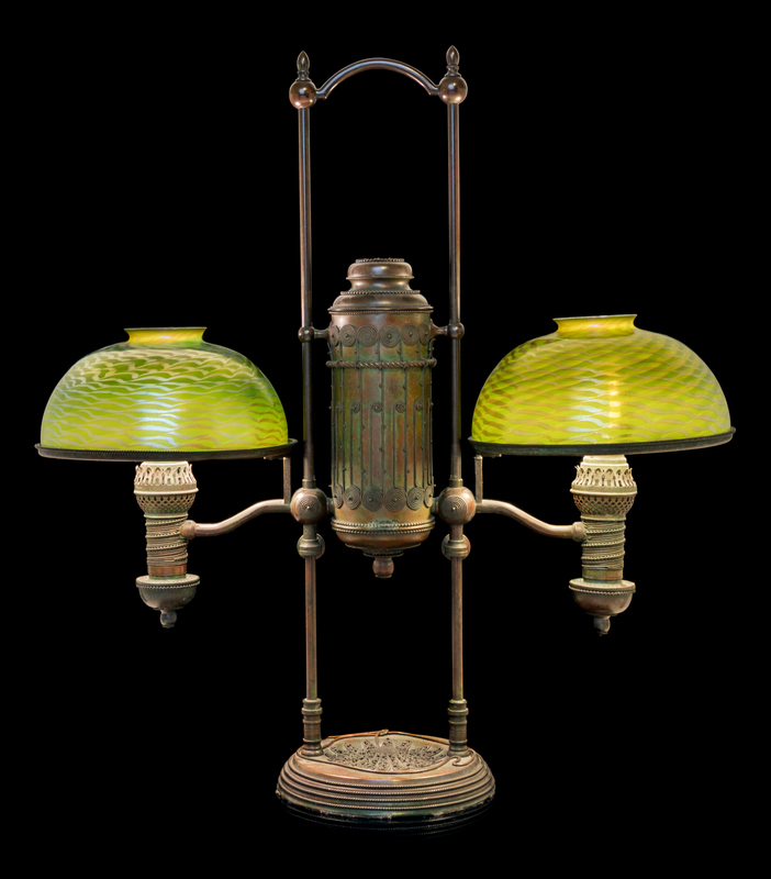 Student Lamp having Damascene glass shades and bronze base cast by Manhattan Brass Co. c. 1900