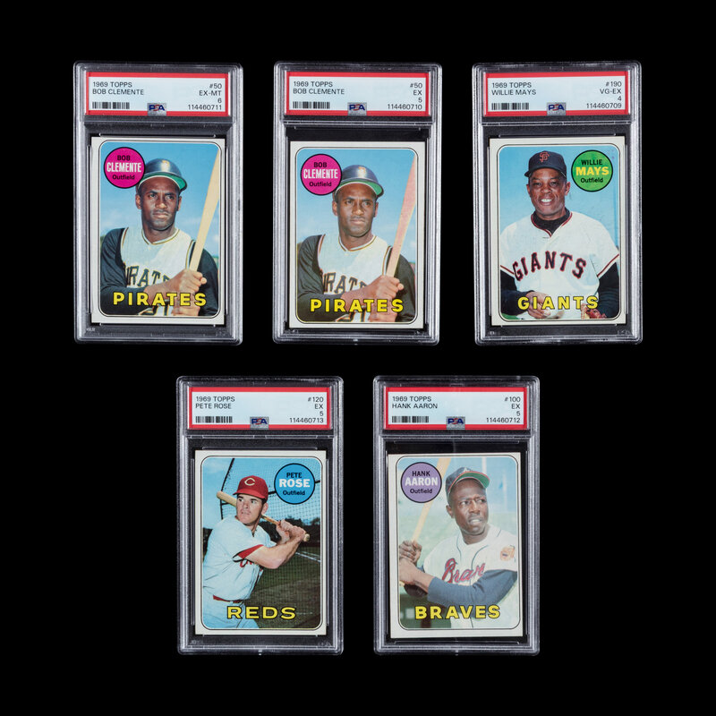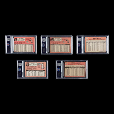 comprising Willie Mays No. 150 PSA 4 VG-EX; Roberto Clemente No. 50 PSA 5 EX and PSA 6 EX-MT; Pete Rose No. 120 PSA 5 EX and Hank Aaron No. 100 PSA 5 EX.