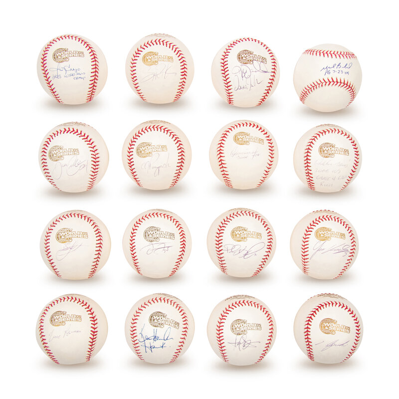 comprising Bobby Jenks, Frank Thomas, Tadahito Iguchi, Orlando Hernandez, Paul Konerko, A.J. Pierzynski, Mark Buehrle, Joe Crede, Scott Podsednik, Juan Uribe, Ozzie Guillen / Ken Williams dual signed, Willie Harris, Tim Raines, Harold Baines, Ken Hawk Harrelson.