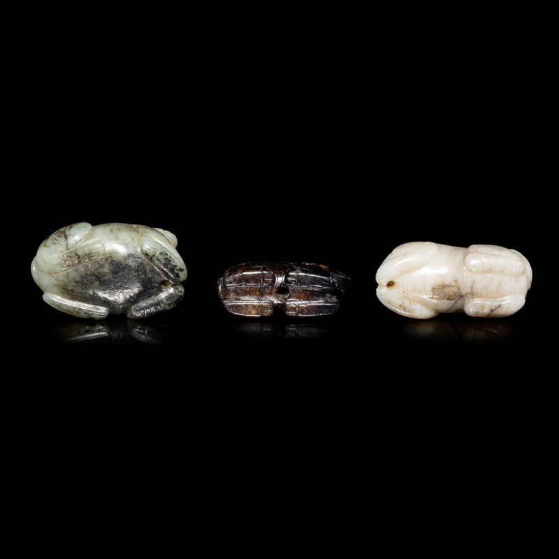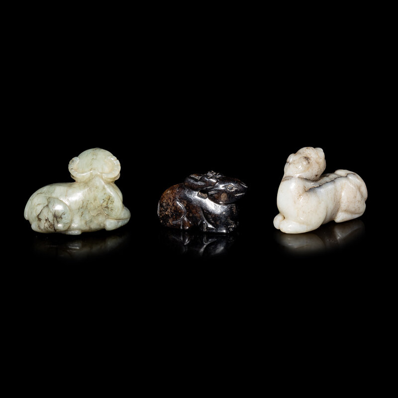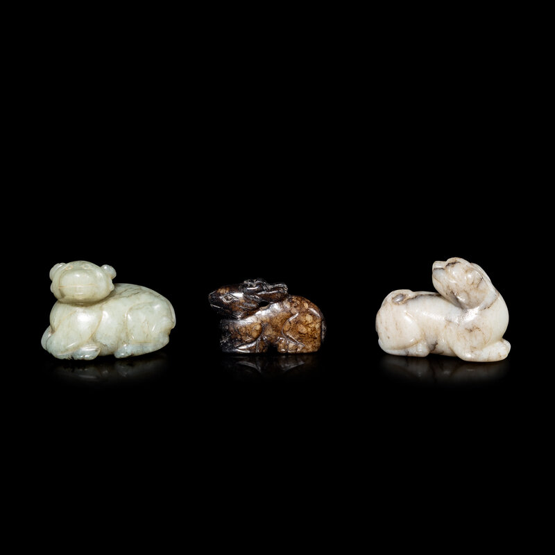 Comprising a black jade deer, a grey jade beast, and a celadon jade beast.
