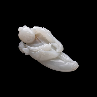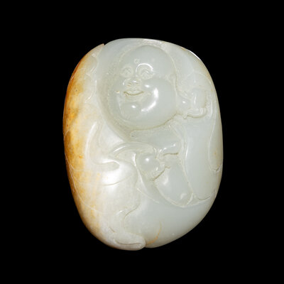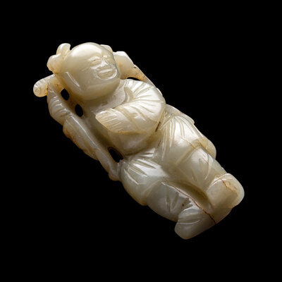 Comprising two figures of boys, one pebble-form carving decorated with lotus leaves, and a reticulated carving depicting a laughing Buddha.