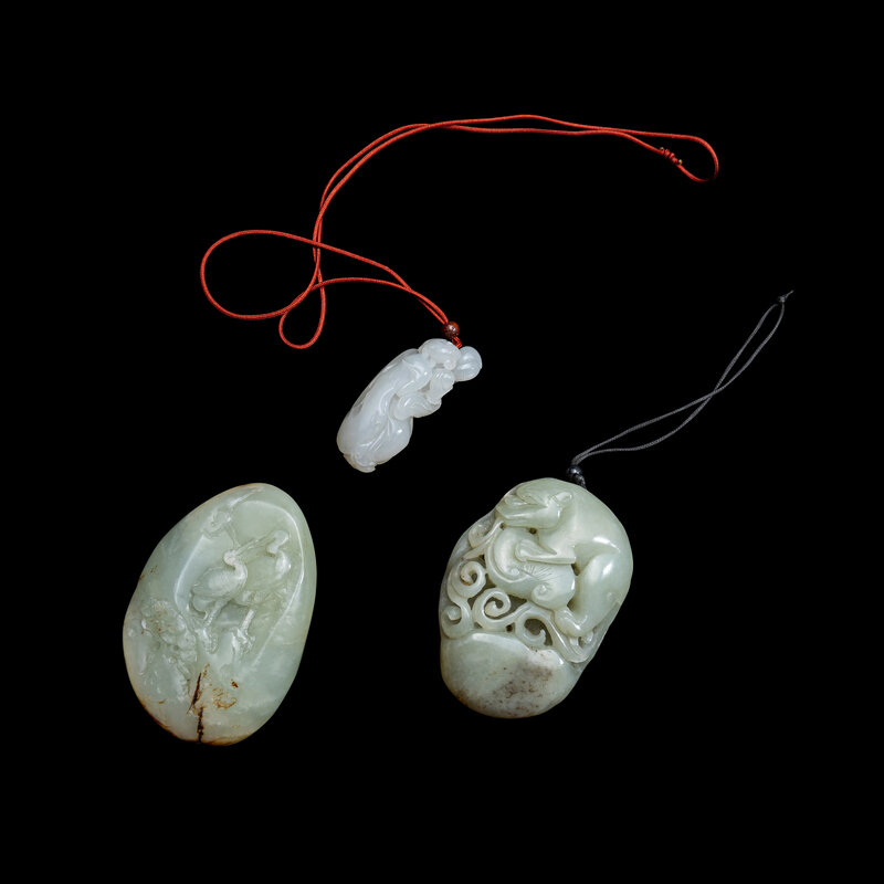 Each of pebble form, carved with a female immortal, a mythical beast, and a crane.
