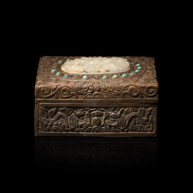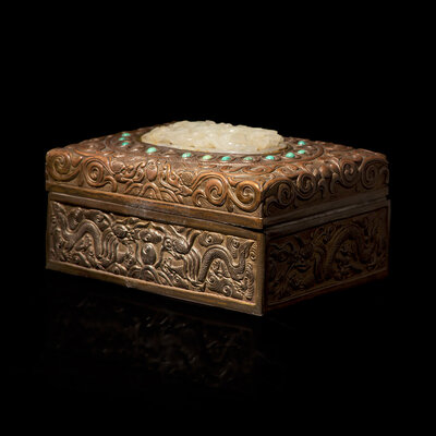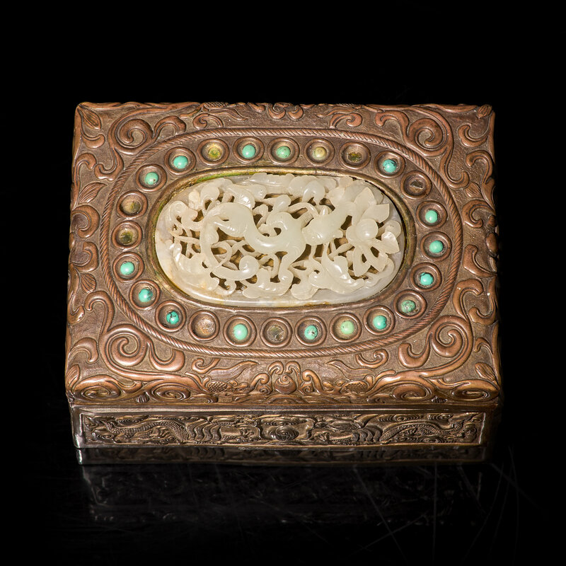 The copper box with low-relief scroll decorations, inlaid with a reticulated oval white jade plaque carved with a Chilong amidst a lotus scroll, surrounded by inset turquoise cabochons.