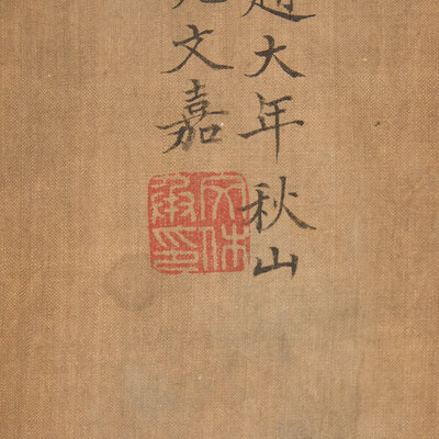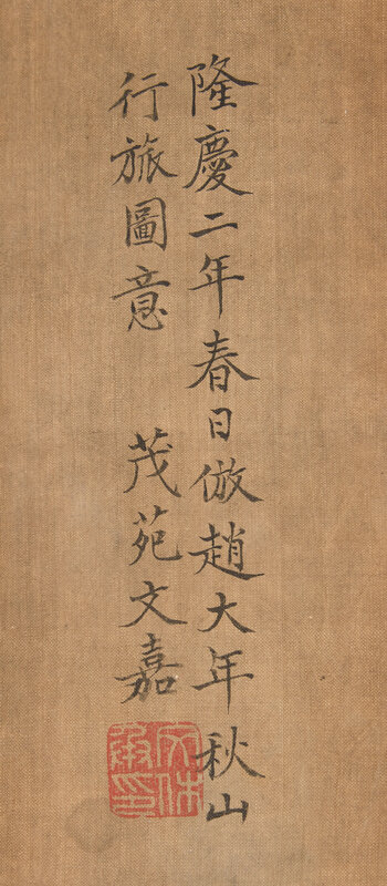 款識:隆慶二年(1567)春日仿趙大年秋山行旅圖意。茂院文嘉。