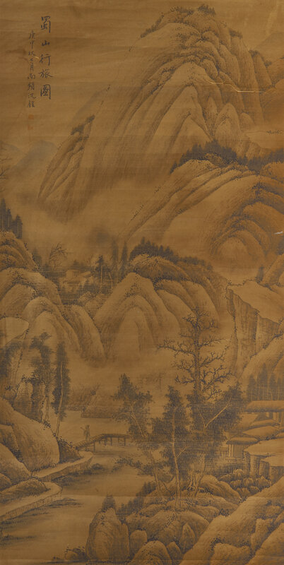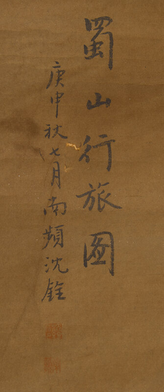 款識:蜀山行旅圖。庚申(1740)秋七月,南頻沈銓。