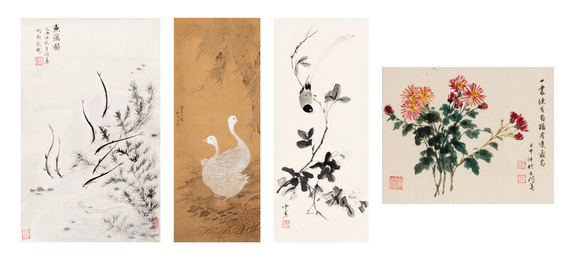 Ink and color on paper, comprising three hanging scrolls and one framed work