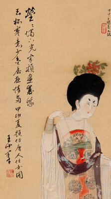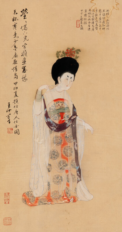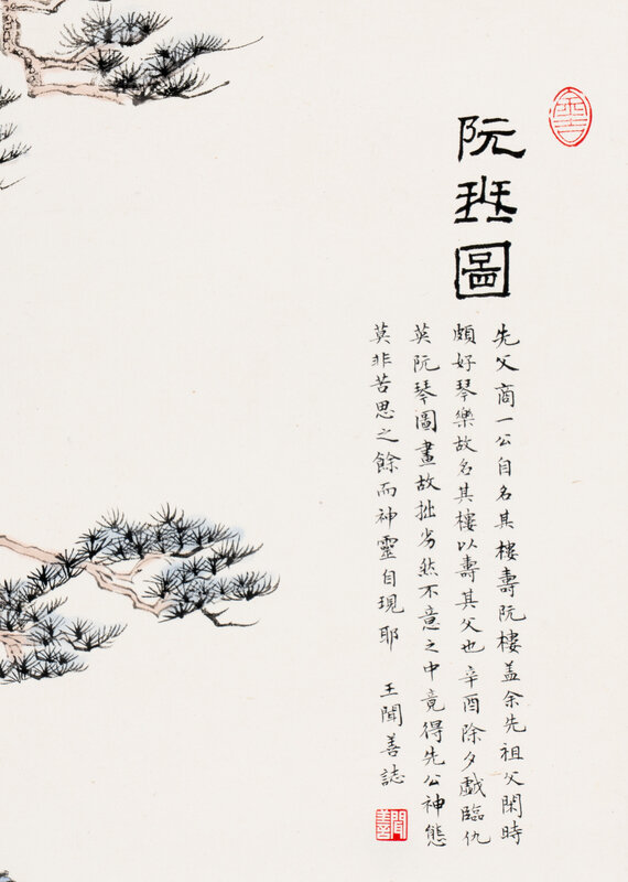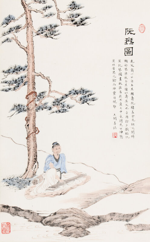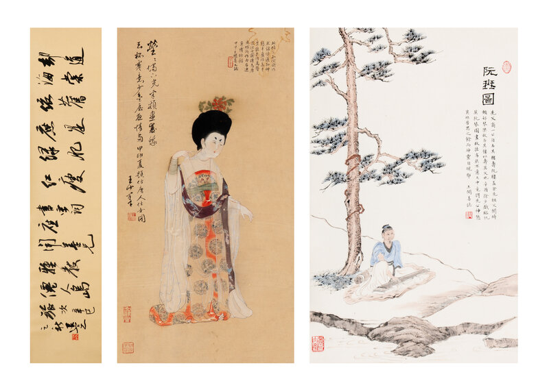 Comprising a Tang-style lady, a scholar playing Ruan under the pine, and a calligrapher.