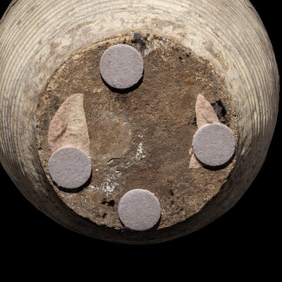 The sturdily potted body of ovoid form, the rounded shoulders tapering to a rolled-lipped rim, covered overall with a beige glaze, painted with scrolling leafy foliage.