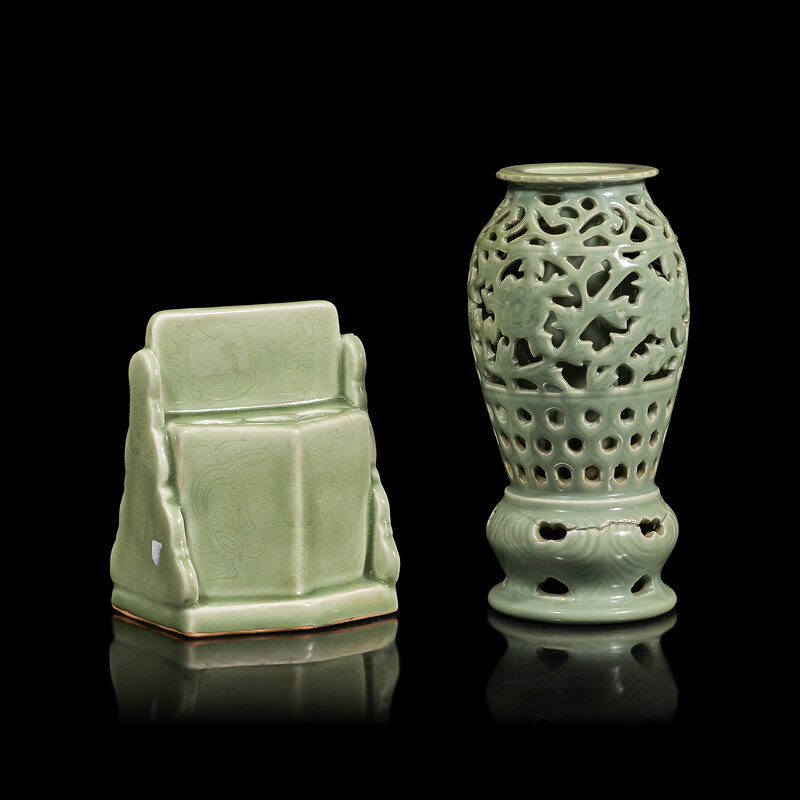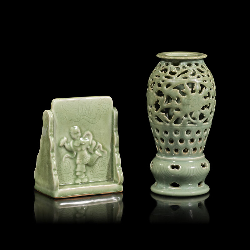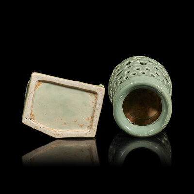 豆青釉鏤雕花卉紋瓶及魁星點斗筆筒各一