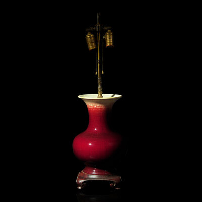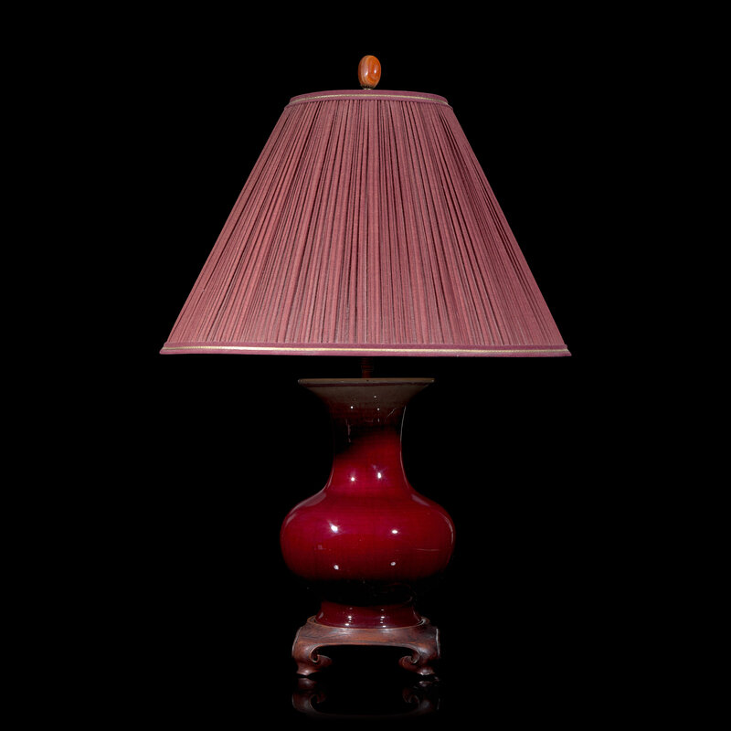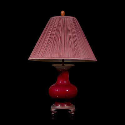 With compressed bulbus body, waisted neck and flared lip, splayed foot, covered with a rich red glaze like crushed strawberries draining from a mushroom tone at the mouth; the finial a large carnelian bead; custom pleated shade.