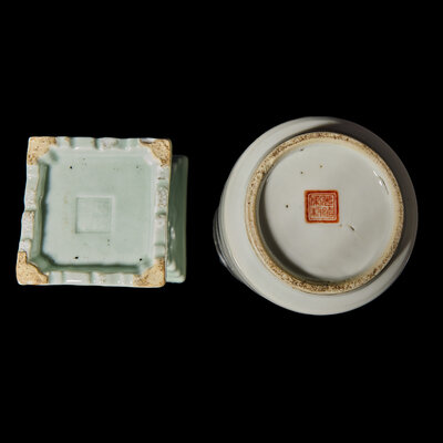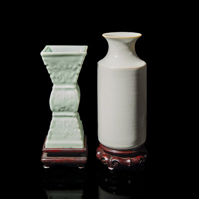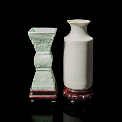 The first a white glazed example having a cylindrical body rising to a recessed neck and a flared mouth, all resting on a short, circular foot, the underside bearing a Guangxu four-character iron red seal mark; the second a pale celadon incised gu-form example, the exterior molded with two pairs of dragons chasing after flaming pearls between two rows of lappet leaves, the underside impressed with an apocryphal Qianlong mark.