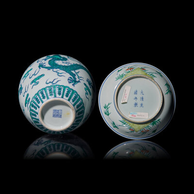 The underside of the "peaches" dish with Guangxu six-character mark, the underside of the jar with six-character Jiaqing seal mark.