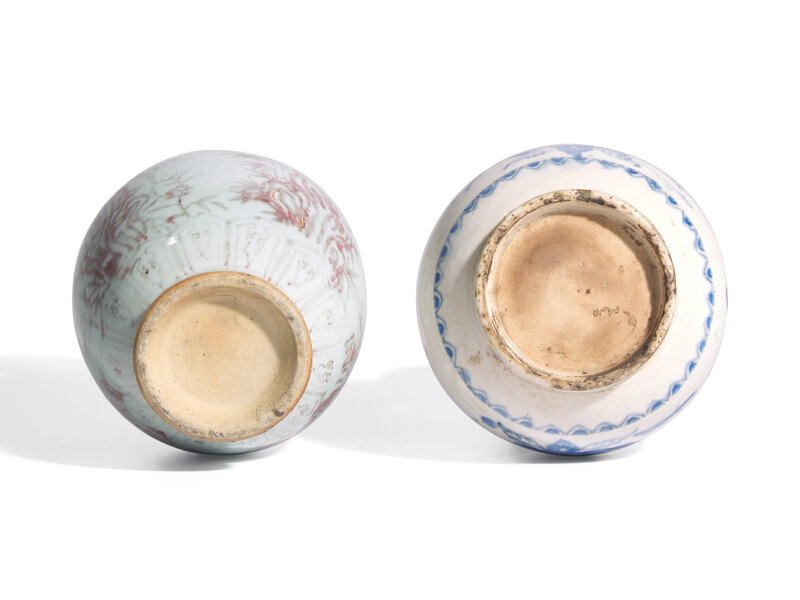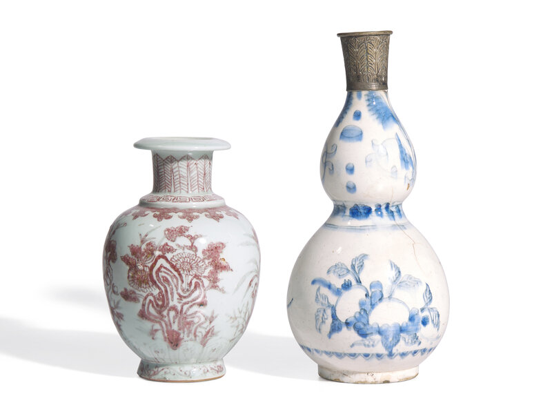 The first a Chinese porcelain baluster vase decorated with copper red chrysanthemums issuing from rockwork; the second, possibly Persian, of double-gourd form, painted with underglaze blue fruits and stylized flowers, the mouth with later metal mounts.