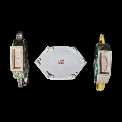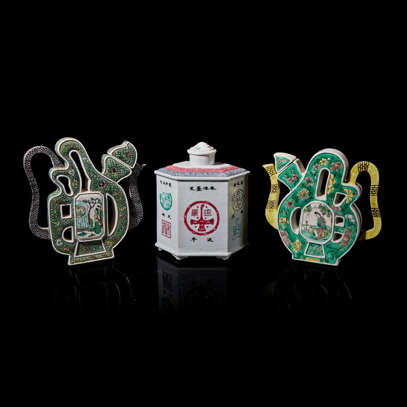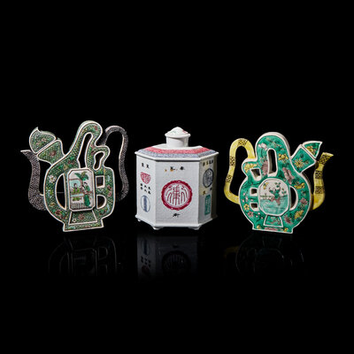 The two puzzle teapots each modelled in the form of a Shou character, the central panel painted with figures, surrounded by floral blossoms against a green ground; the hexagonal tea caddy enameled and decorated with seals and inscriptions in various forms.