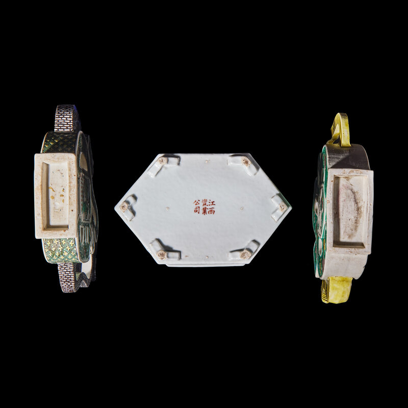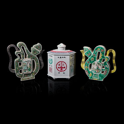Two Chinese Famille Verte Porcelain "Puzzle" Teapots and An Enameled Porcelain Hexagonal Tea Caddy, Late 19th-Early 20th Century