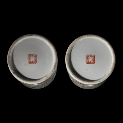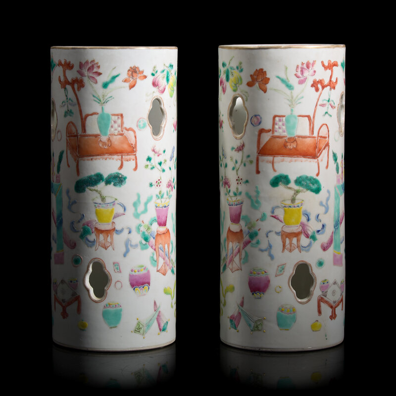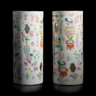 Minyao; Each cylindrical vessel pierced with "Begonia Blossom"-shaped apertures, decorated with assorted "Antiques" and auspicious items. Undersides with four-character seal marks stamped in iron red enamel.