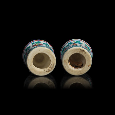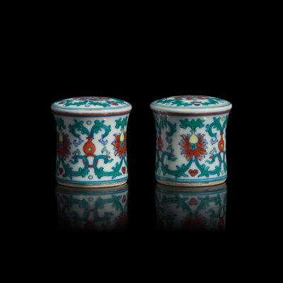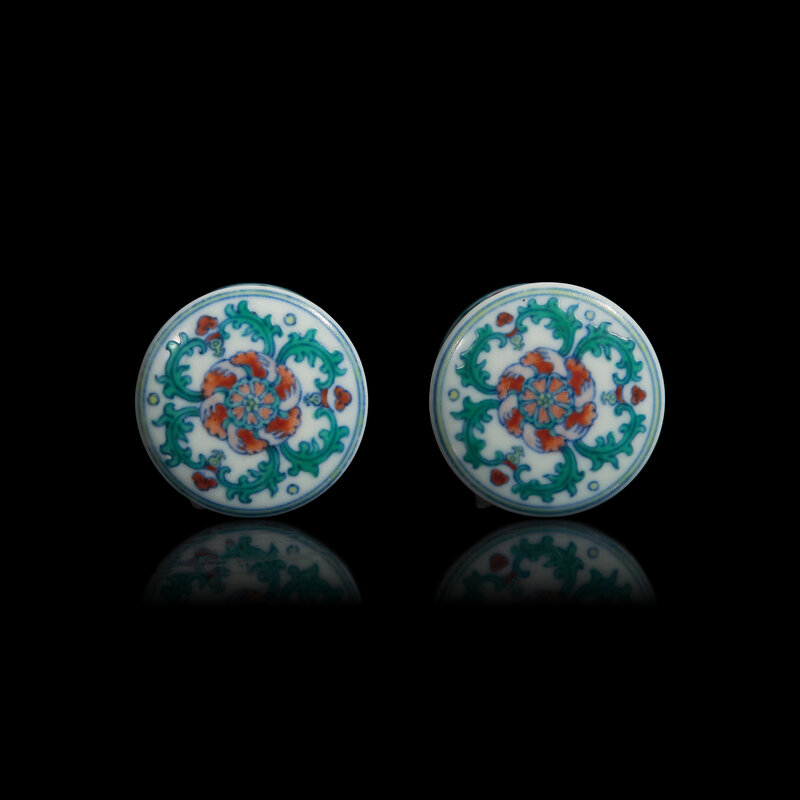 A Pair of Chinese Doucai Porcelain Scroll Caps