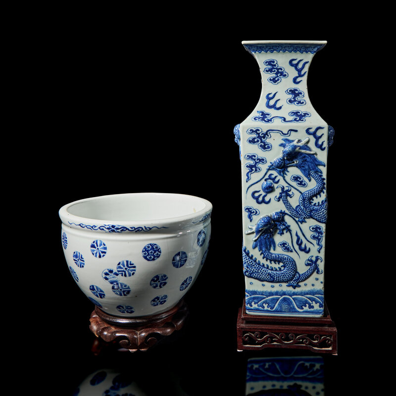 晚清-民國 青花雲龍紋方瓶及繡球花卷缸各一