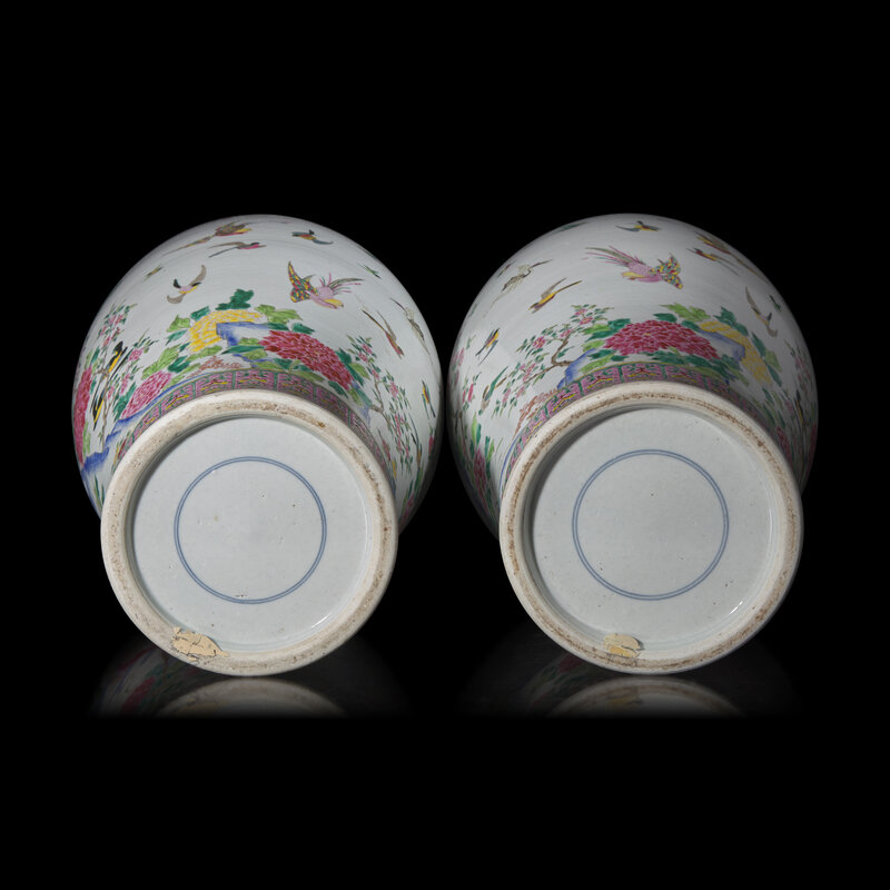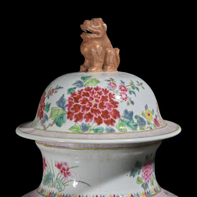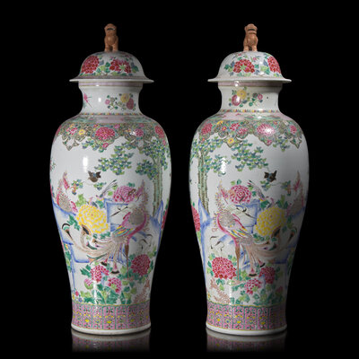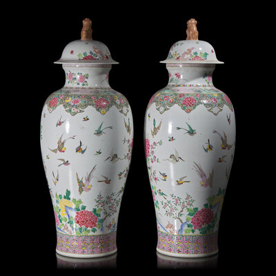With mirrored decoration of paired birds among a flowering landscape, lion finials to domed covers.