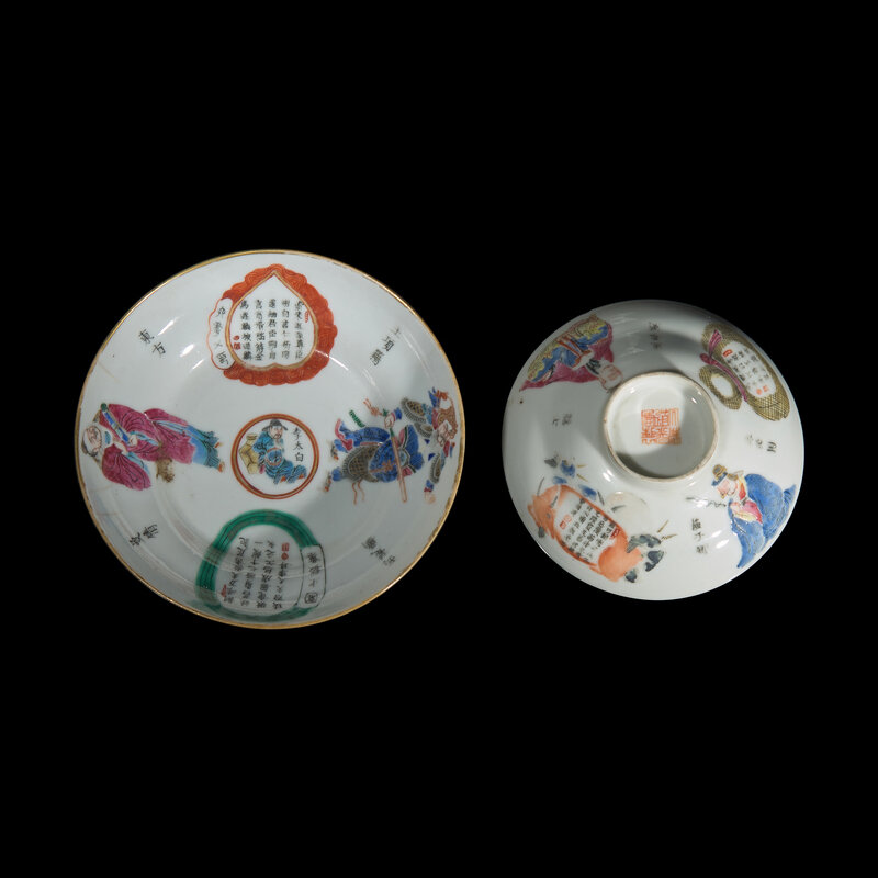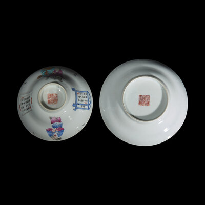 Comprising a bowl, saucer, and two covers, the saucer and covers with six-character Daoguang seal mark, the cup with four-character Xianfeng seal mark.