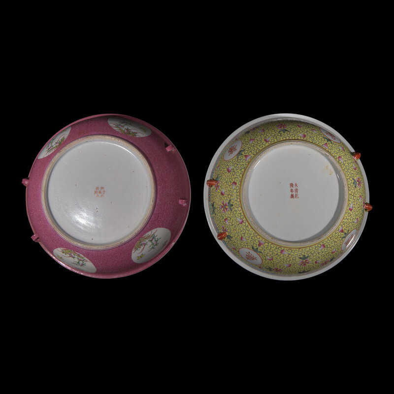 The first decorated with longevity characters and lotus scrolls against a yellow ground, the second with medallions enclosing birds and flowers against a sgrafitto ruby red ground.
