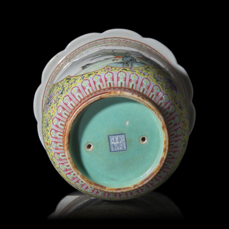 With floral decoration against a bright yellow ground; floral reserves with inscriptions, underside with apocryphal Qianlong mark.